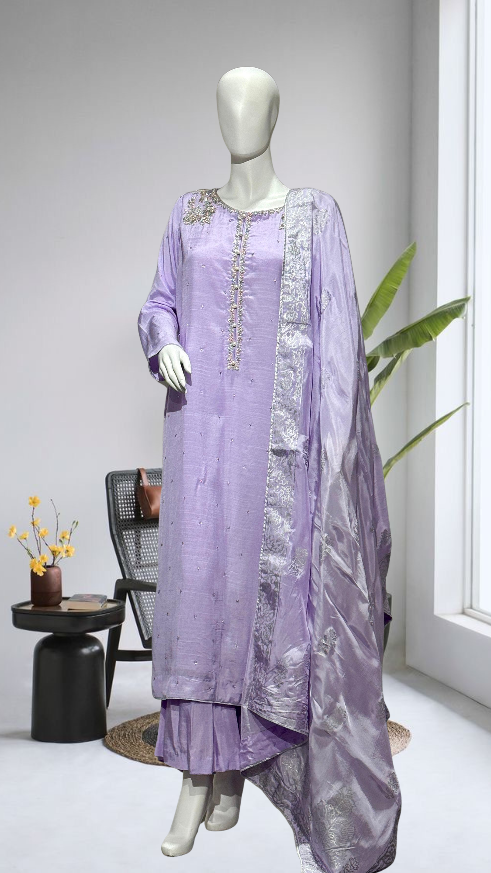 Step into timeless grace with this soft lilac 3-piece outfit, beautifully crafted in luxurious fabric.