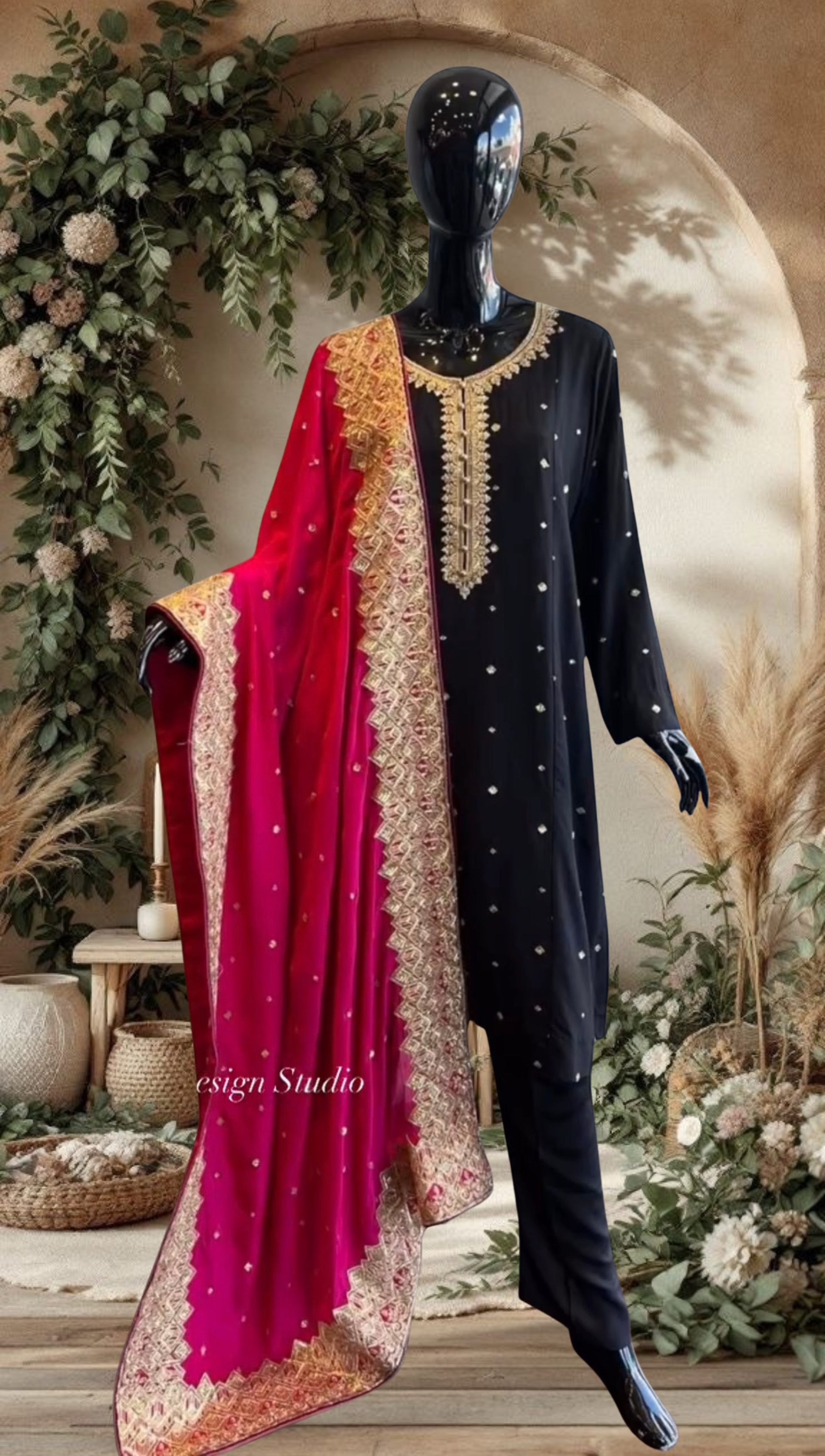 • Dupatta: The focal point is the magnificent Rani Pink (Fuschia) velvet dupatta. It is richly decorated with elaborate, dense gold zari and sequin work along all borders, providing a luxurious feel and a breathtaking colour contrast against the black.