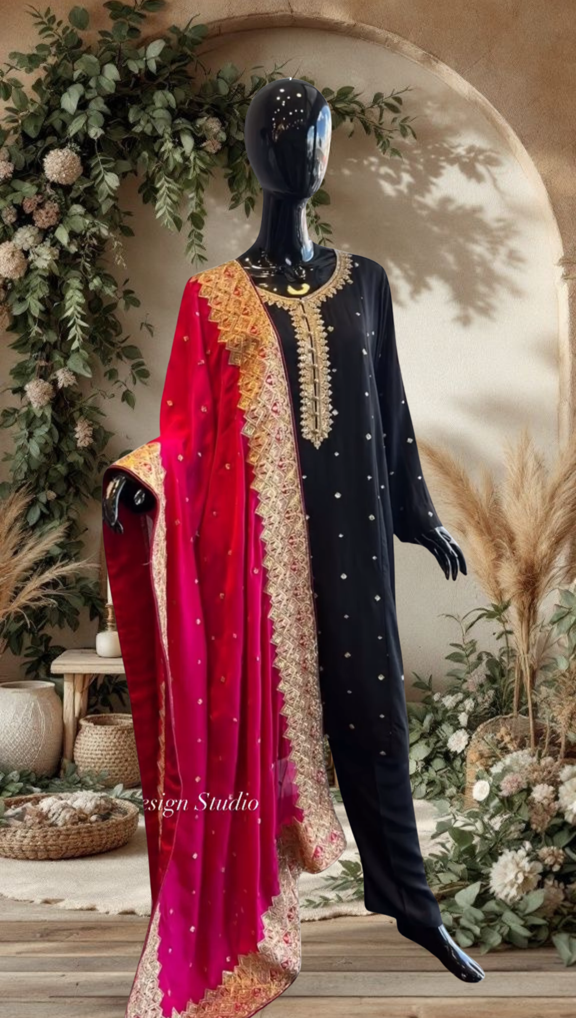 Achieve a look of timeless glamour with this striking three-piece ensemble featuring a classic black suit and a dramatically rich dupatta. This outfit perfectly balances understated elegance with festive opulence.