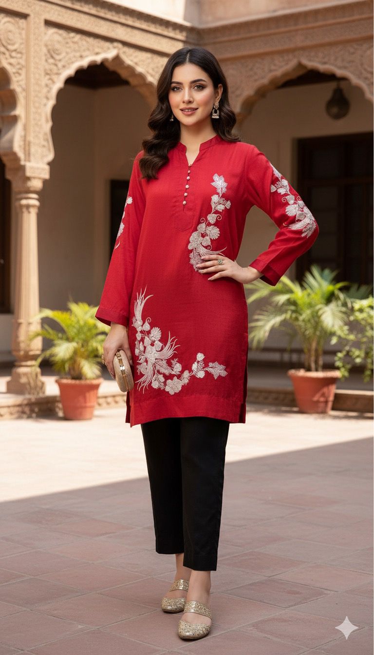 Adorn yourself in this striking crimson red kurti, a perfect blend of tradition and contemporary style. Crafted from a comfortable, breathable fabric, this knee-length straight kurti features exquisite white floral embroidery that elegantly trails along the yoke and the lower side panel.