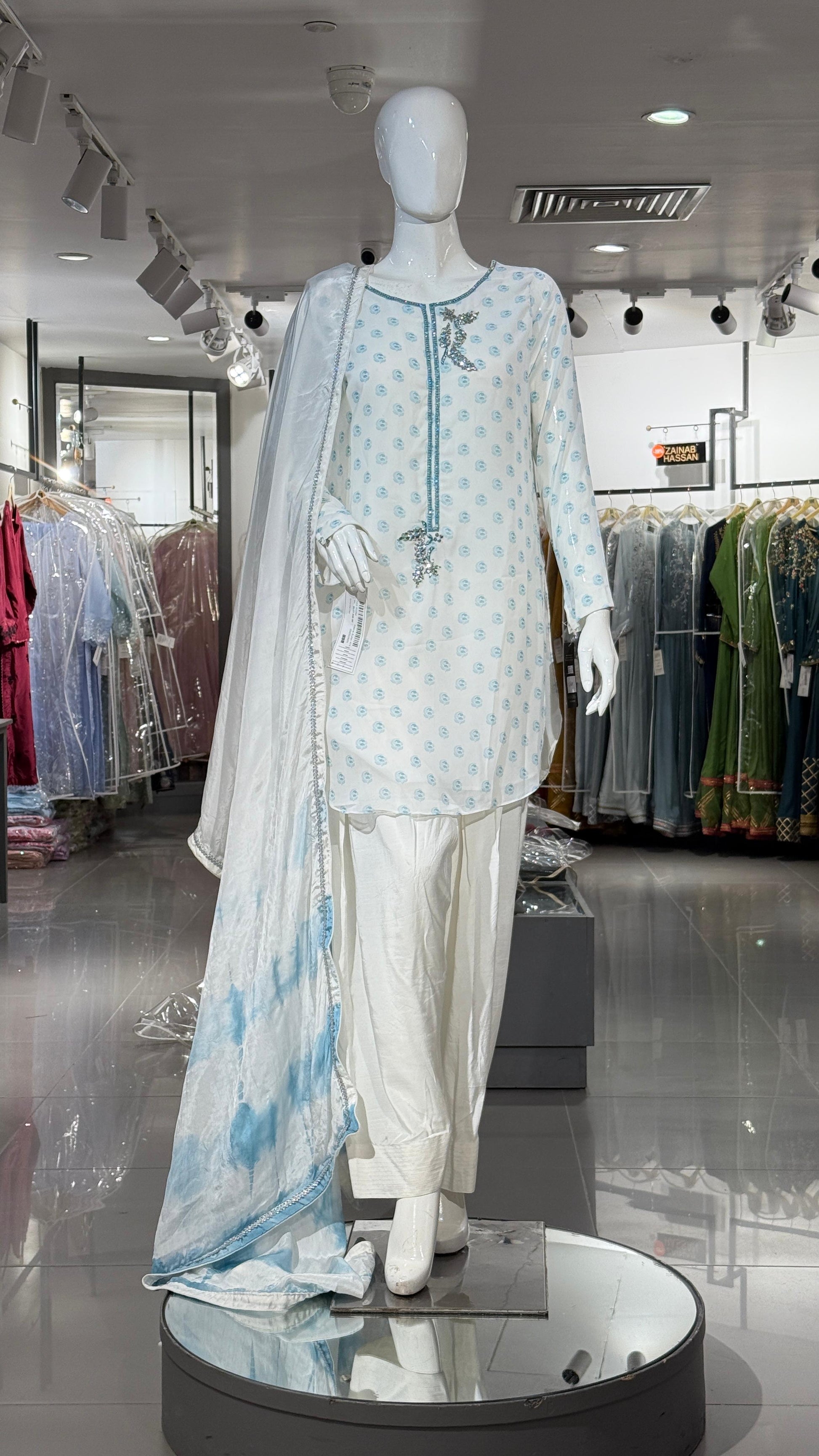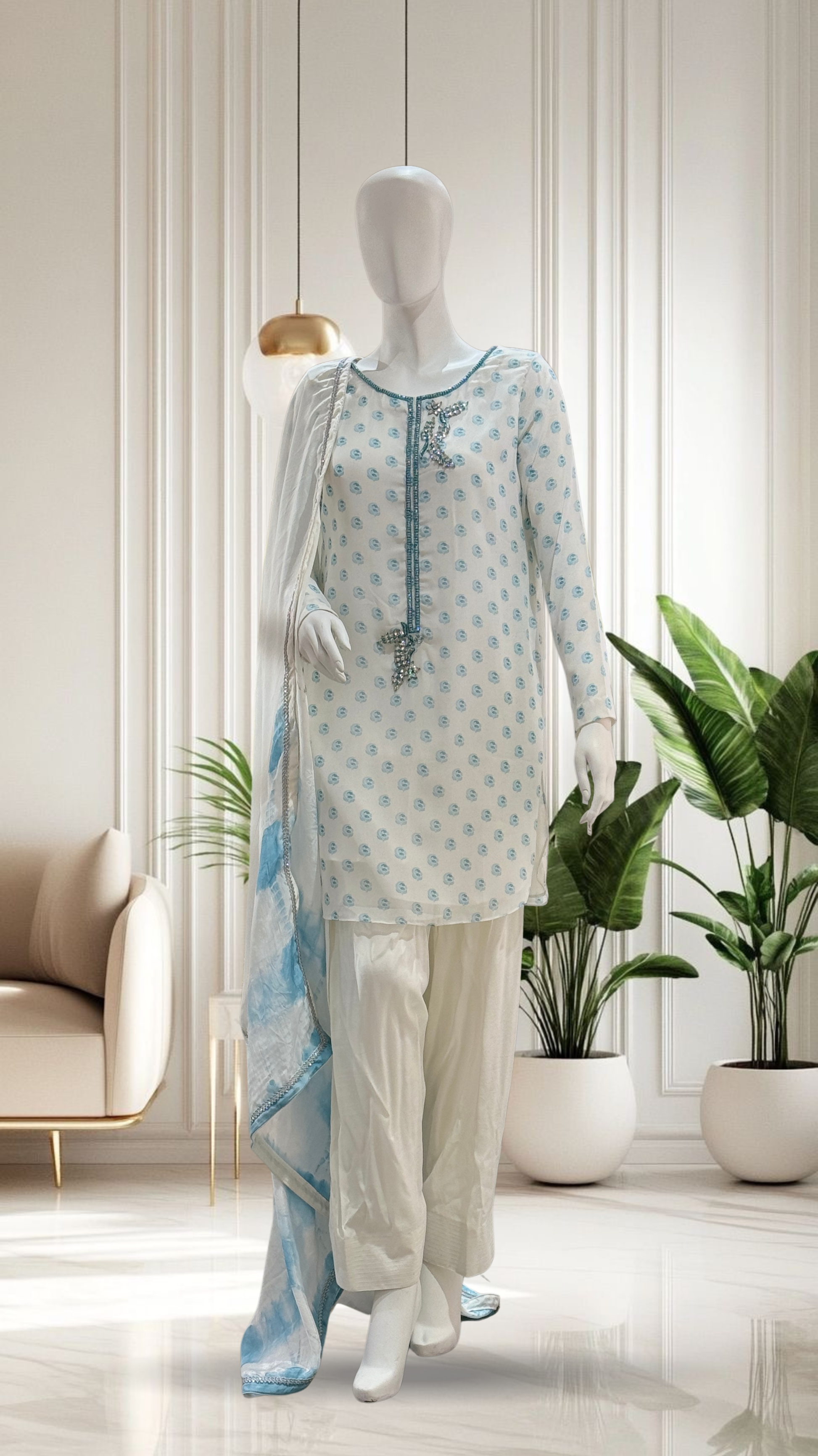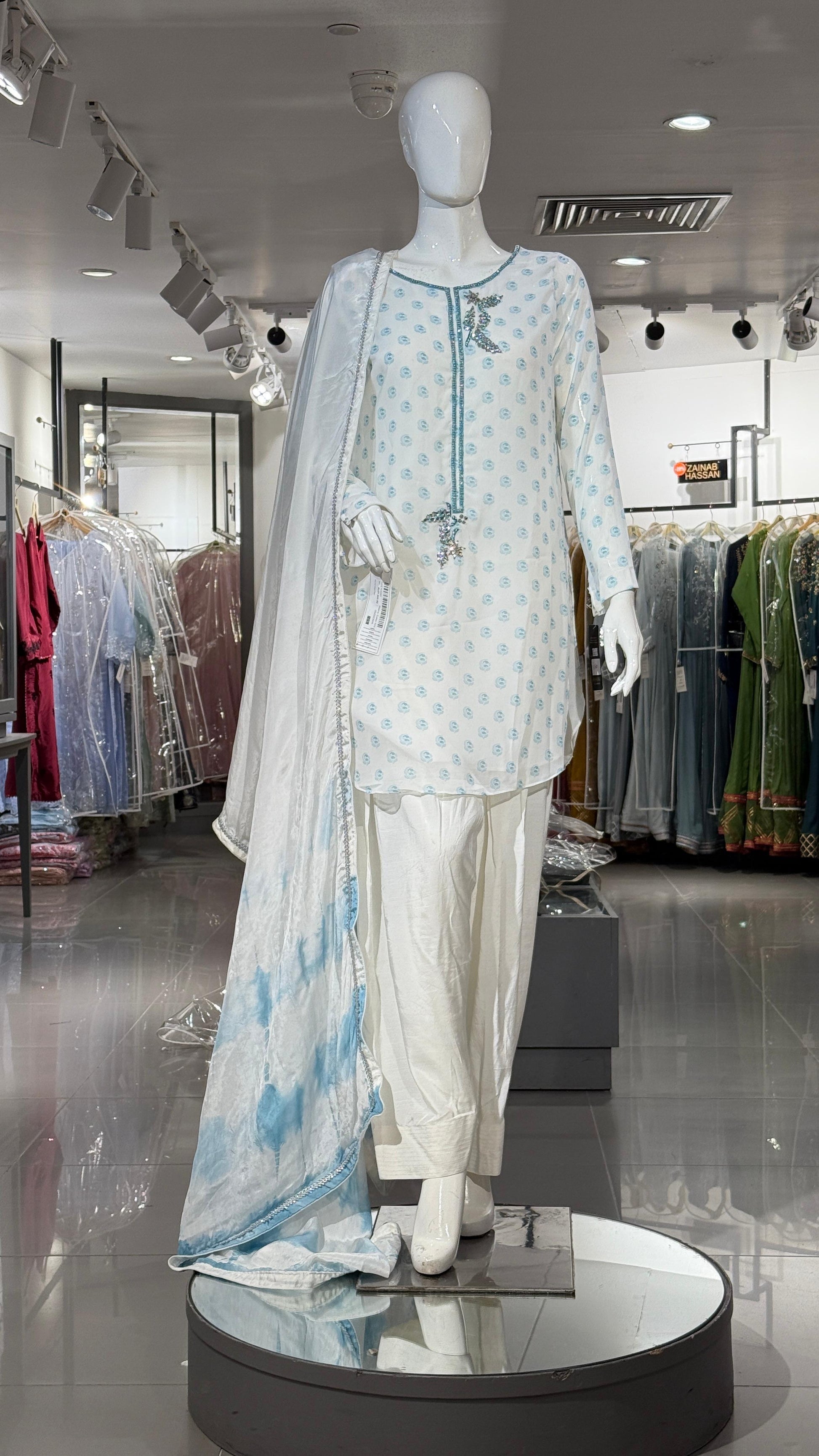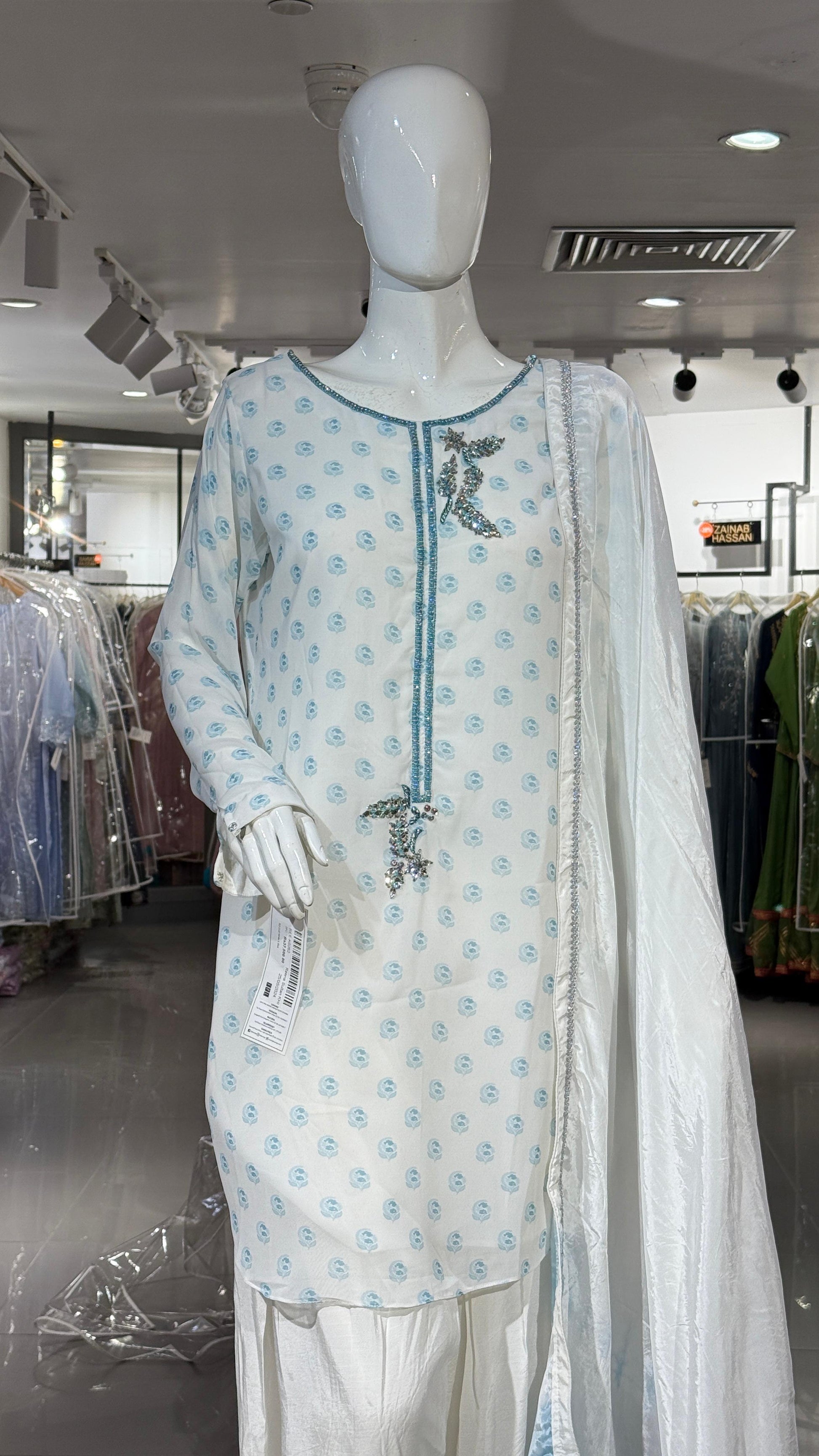 • Kurta: A pristine off-white straight-fit kurta adorned with a subtle sky-blue block or dabu print (small repeating motifs). The neckline is beautifully highlighted with delicate blue and silver embellishments running down the center front.