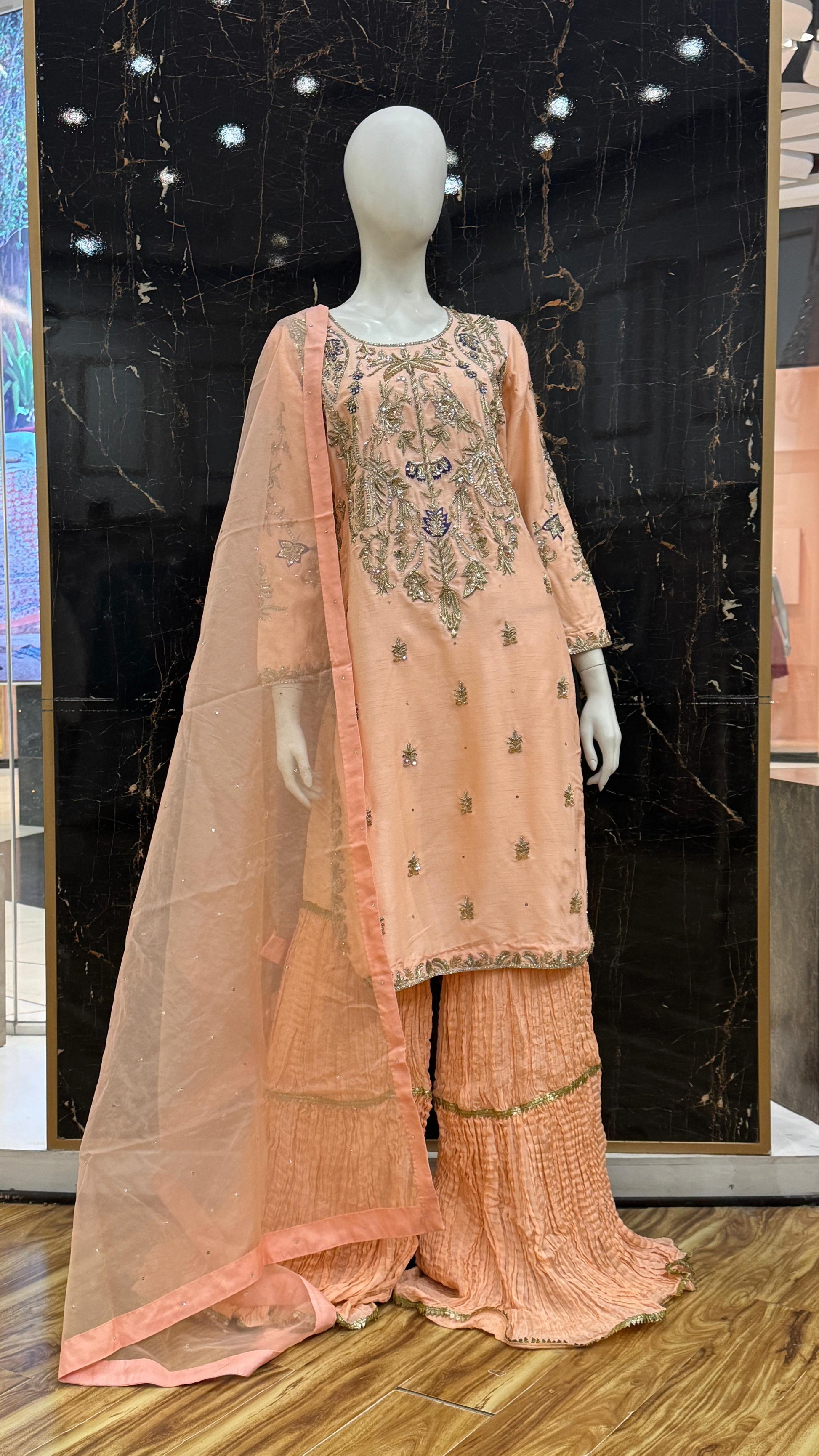 • Sharara: A traditional and highly fashionable crushed or pleated sharara in a matching peach hue, offering beautiful volume and movement. The flared hem is trimmed with delicate gold accents.