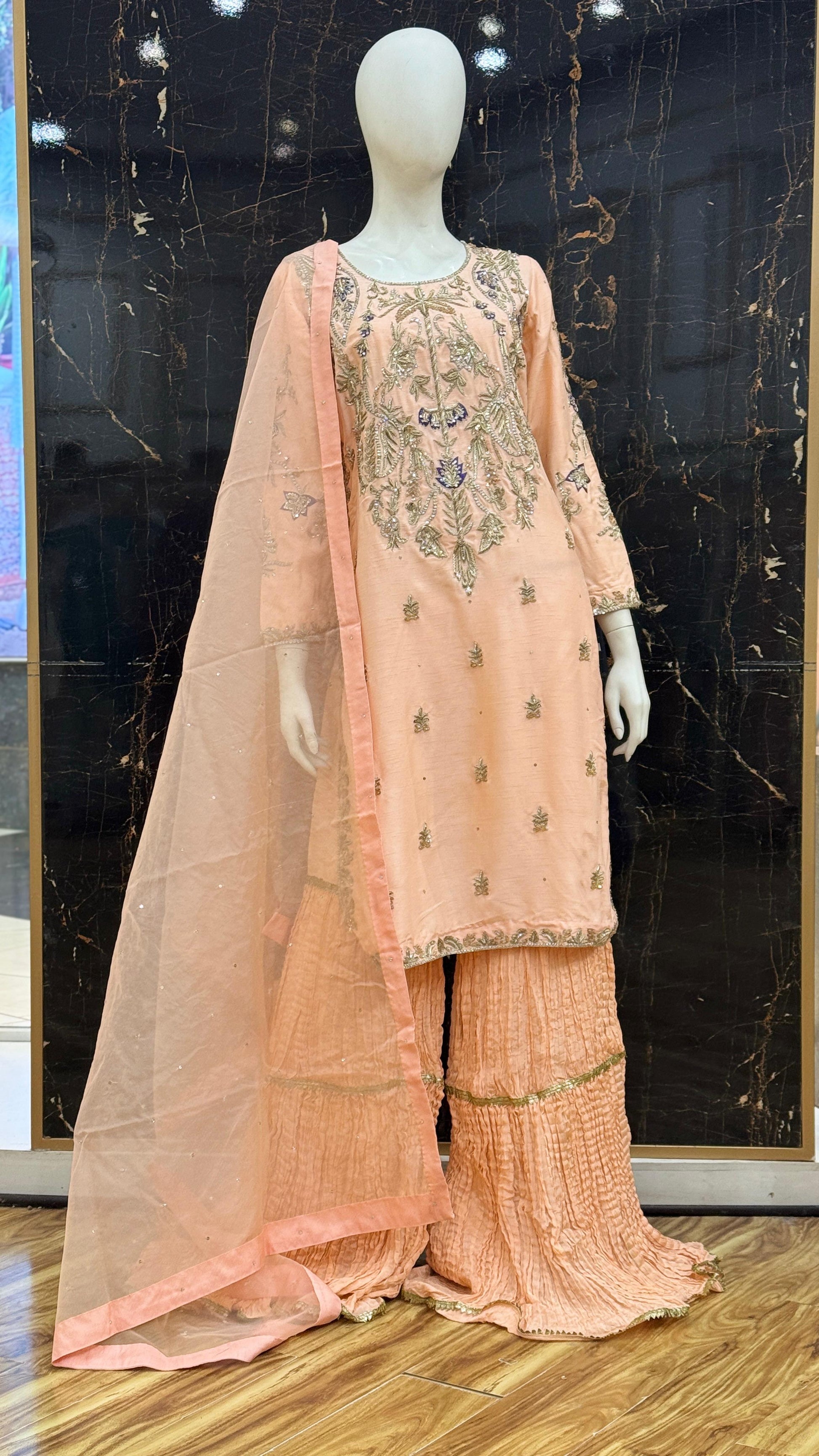 Radiate warmth in this exquisite three-piece sharara set in a soft, flattering peach tone. This ensemble is designed for celebration, featuring a stunning balance of intricate handwork and flowy texture.