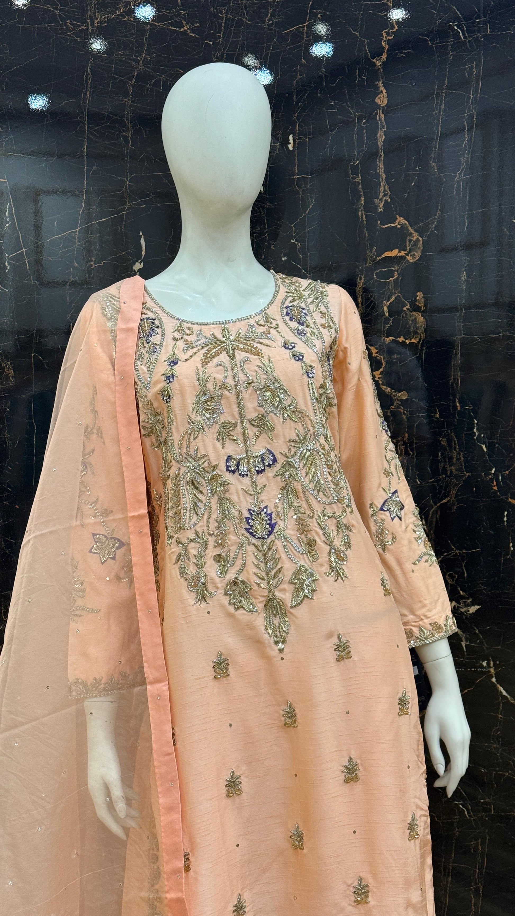 • Dupatta: A light and airy net dupatta in coordinating peach, finished with subtle sparkle or small border detailing, draping elegantly.