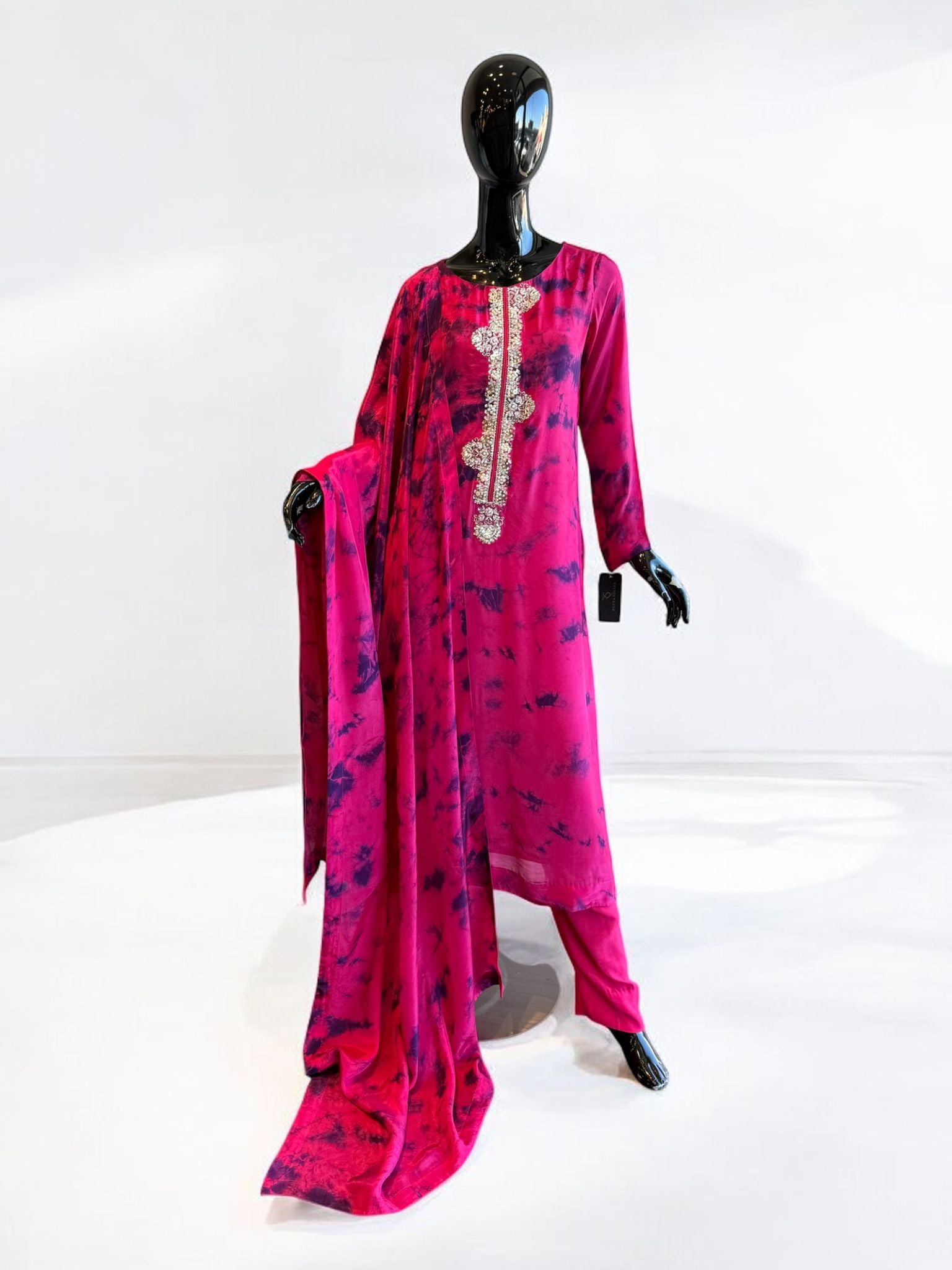 Step into effortless elegance with this stunning tie-dye lawn ensemble, blending earthy beige tones with bold black accents. The outfit features intricate hand-embellished detailing along the neckline, adding a touch of sparkle and sophistication. Paired with a matching dupatta and straight-cut trousers, this look perfectly balances modern artistry and traditional charm.